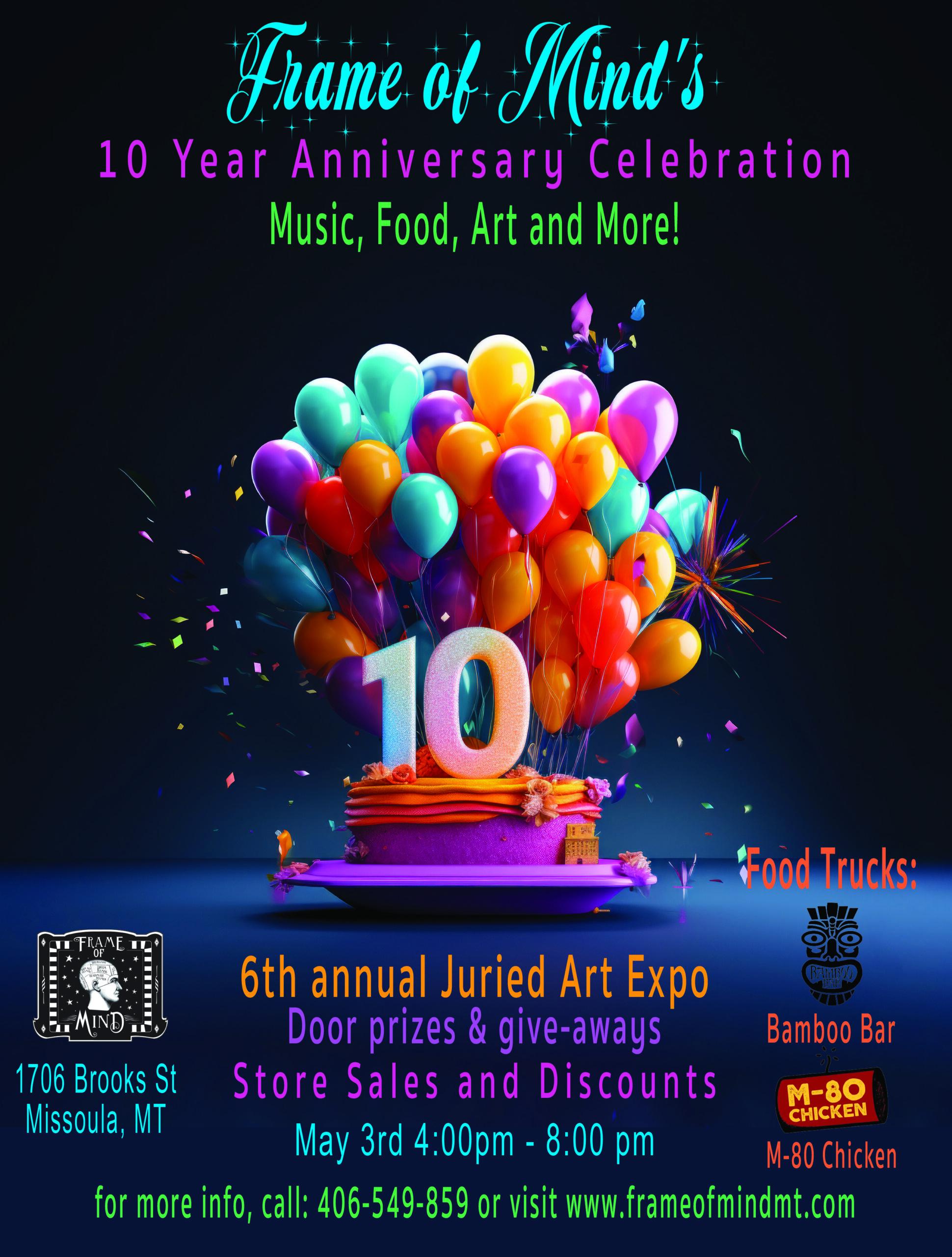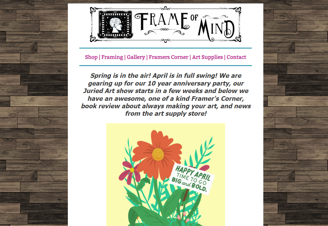 Spring is in the air! April is in full swing! We are gearing up for our 10 year anniversary party, our Juried Art show starts in a few weeks and below we have an awesome, one of a kind Framer’s Corner, book review about always making your art, and news from the art supply store!