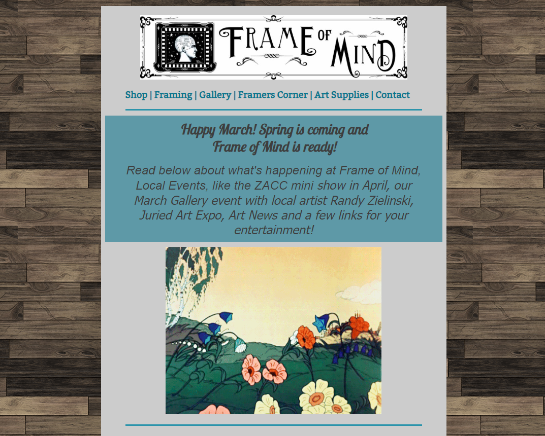 Read below about what’s happening at Frame of Mind, Local Events, like the ZACC mini show in April, our March Gallery event with local artist Randy Zielinski, Juried Art Expo, Art News and a few links for your entertainment!