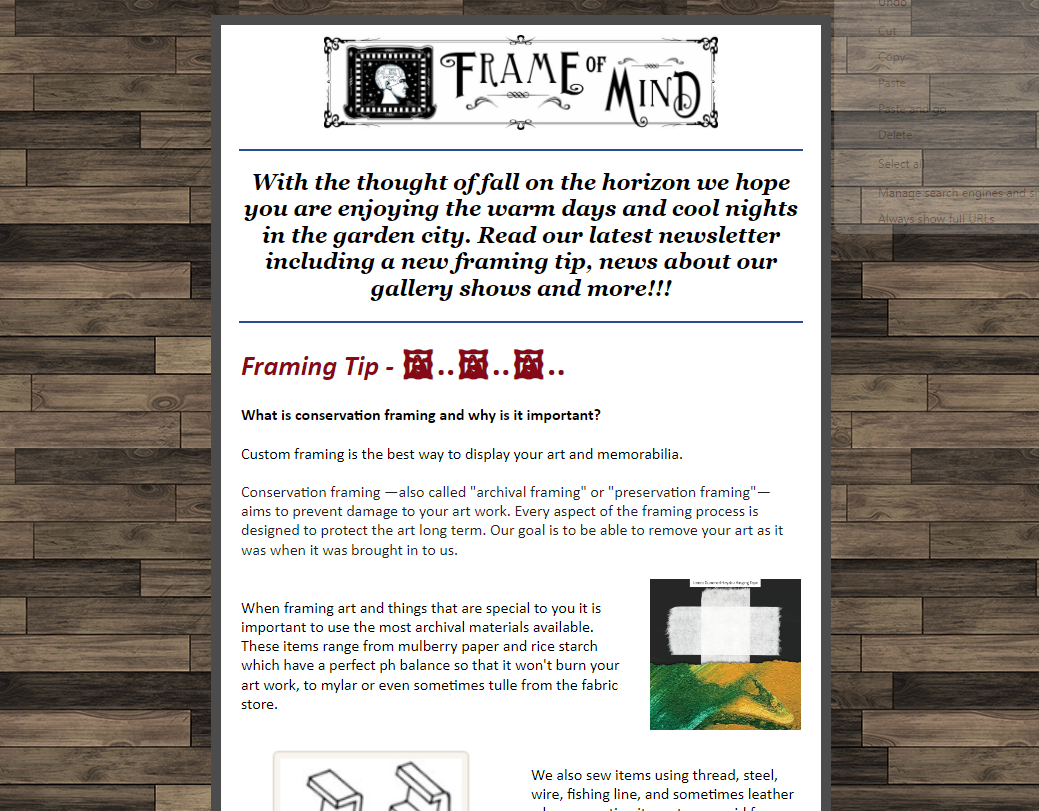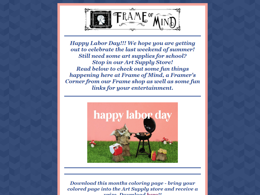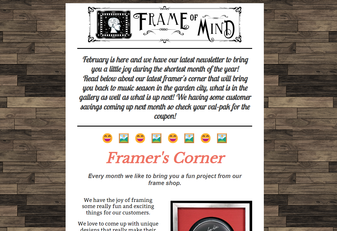 Read below about our latest framer’s corner that will bring you back to music season in the garden city, what is in the gallery as well as what is up next! We having some customer savings coming up next month so check your val-pak for the coupon!